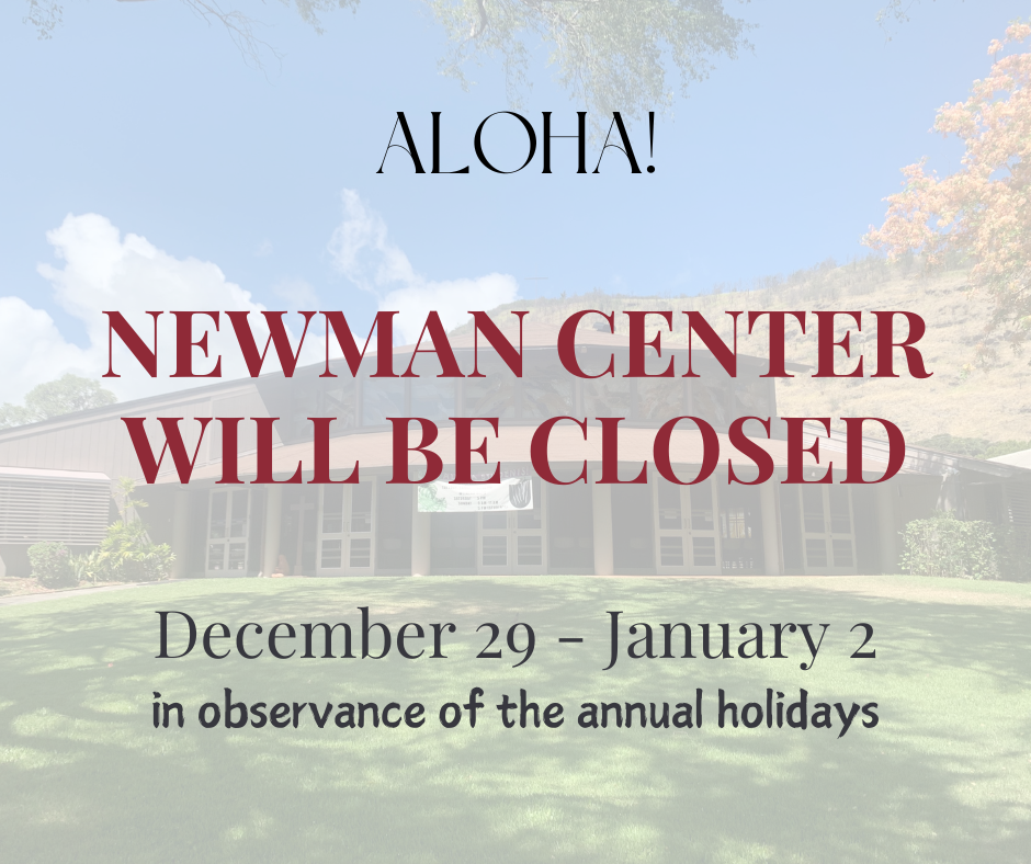 We are here to share the gospel of Jesus Christ with the students, faculty, and staff of the University of Hawaiʻi at Mānoa. Serving as both a Catholic campus ministry and local parish, Newman Center Hawaiʻi invites you to join us for Mass and our many faith – and fellowship-building activities for all ages. Come, and be inspired. Come journey with us!